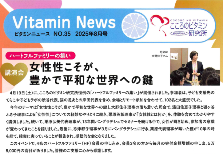 2025.03.21 ビタミンニュース NO.35 2025年8月号 Tweet Share Hatena Pocket RSS feedly Pin it 「NO.35の閲覧はこちらから」をクリックすると記事の詳細が見られます NO.35の閲覧はこちらから Tweet Share Hatena Pocket RSS feedly Pin it 2025年ハートフルファミリーの集い 女性性こそが、豊…前の記事 ハートフルファミリーの集い開催しました!次の記事